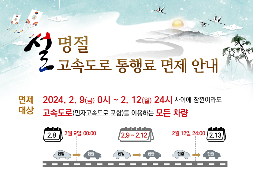 이번 설 연휴에는 더욱 넉넉해진 통행료 면제 기간을 잘 활용하시어 편안한 귀성길 되시기 바랍니다. 특히 하이패스 이용자는 단말기 점검, 일반차량은 통행권 보관에 유의해주세요. 안전운전 하시고 즐거운 명절 보내세요!