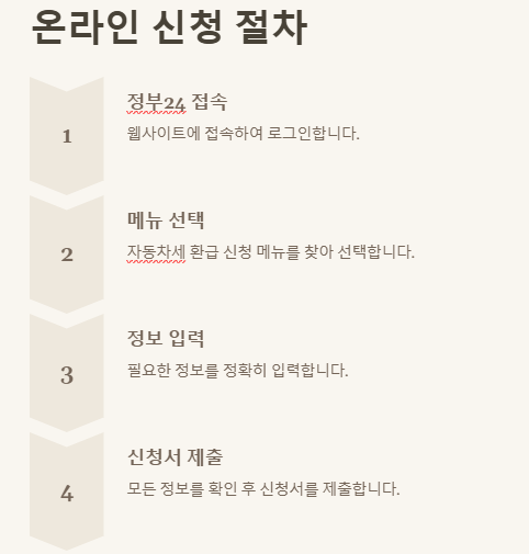 1. 온라인 신청: 정부 24 웹사이트에 접속하여 로그인 후, 자동차세 환급 신청 메뉴를 선택합니다. 필요한 정보를 입력하고 신청서를 제출하면 됩니다.