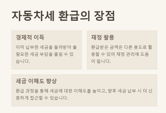 자동차세 환급의 가장 큰 장점은 이미 납부한 세금을 돌려받을 수 있다는 점입니다. 이를 통해 불필요한 세금 부담을 줄일 수 있으며, 환급받은 금액은 다른 용도로 활용할 수 있습니다.