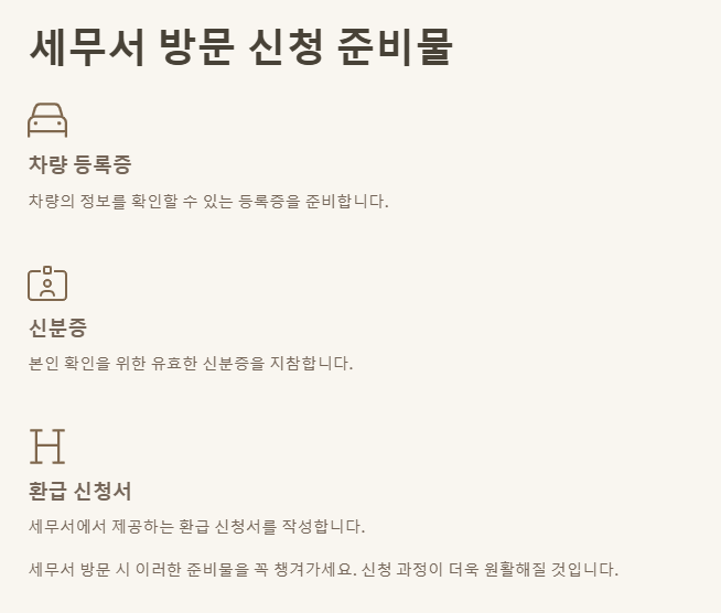 2. 세무서 방문: 가까운 세무서를 방문하여 환급 신청서를 작성하고 제출할 수 있습니다. 이 경우, 차량 등록증과 신분증을 지참해야 합니다.